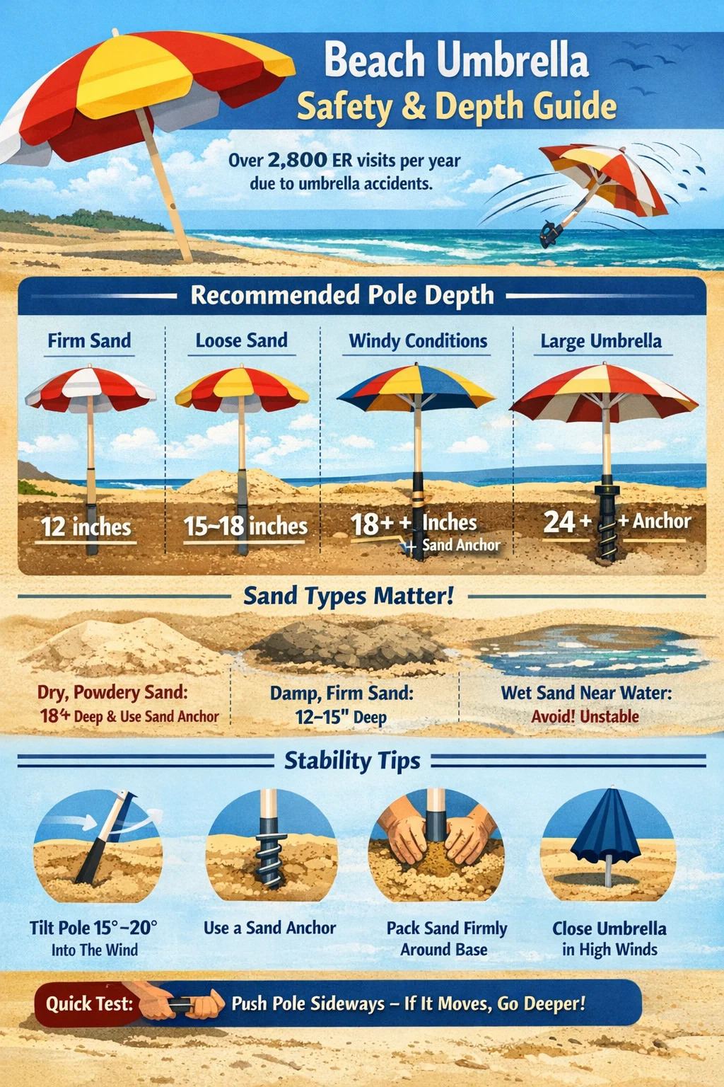 حداقل توصیه شده به طور گسترده 12 اینچ در شرایط متوسط ساحل اعمال می شود: شن و ماسه نسبتا فشرده، نسیم ملایم تا ملایم (کمتر از 10 مایل در ساعت) و یک چتر ساحلی استاندارد 6-7.5 فوت. در شرایط دنیای واقعی، اغلب باید عمیق تر بروید.