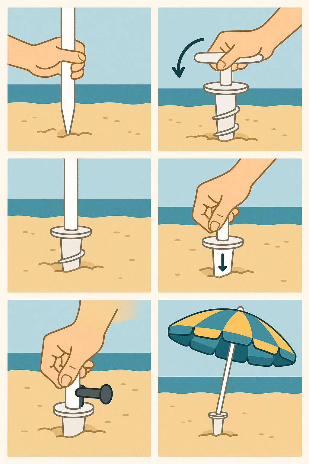 با استفاده از لنگر شنی چتر ساحل اطمینان حاصل می کند که چتر در نسیم دریا ثابت می ماند. در اینجا مراحل دقیق وجود دارد: