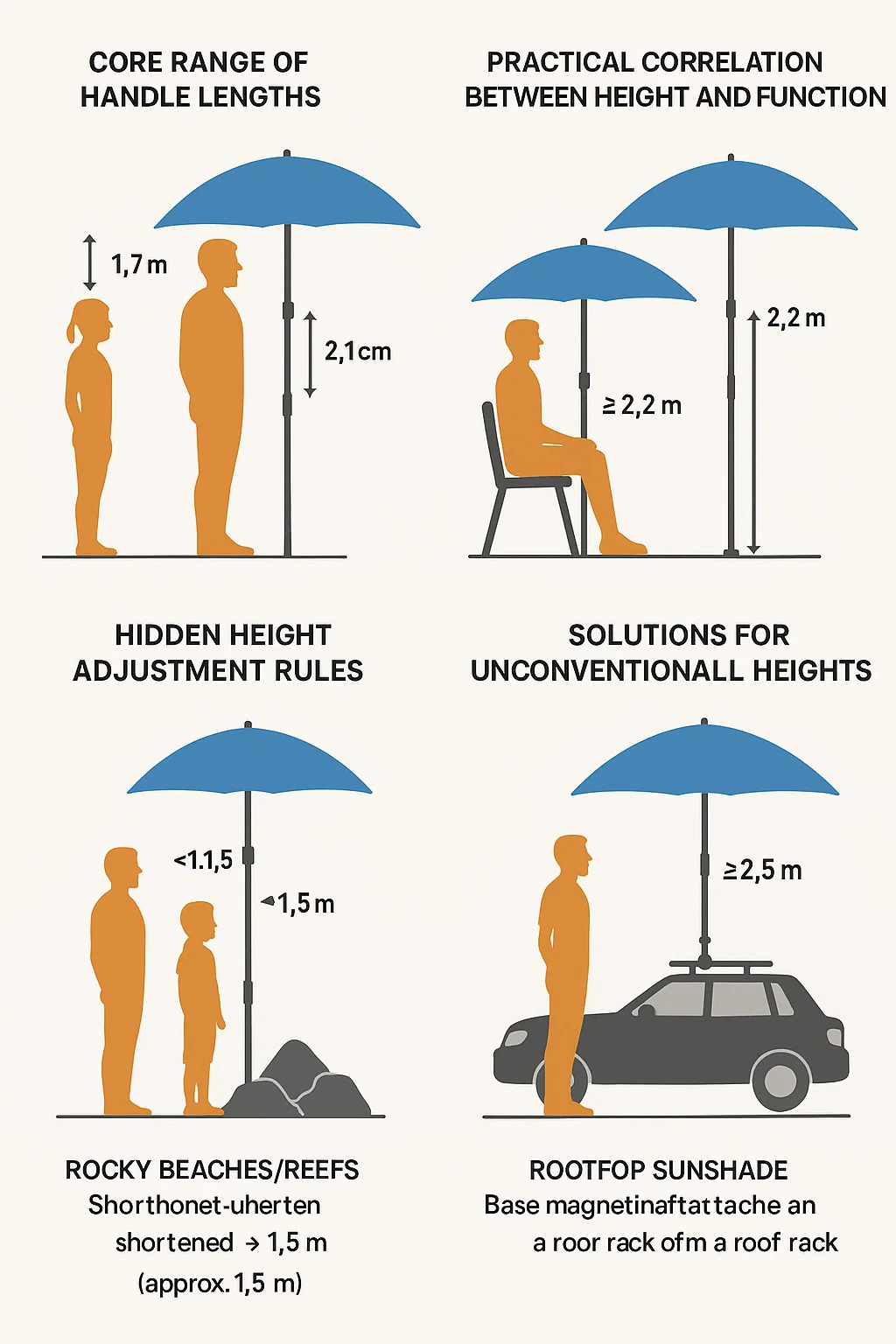 چترهای کوتاه (1.8 متر): برای محافظت از آفتاب هنگام نشستن طراحی شده است. ارتفاع لبه با پشتی یک صندلی ساحلی (70-80 سانتی متر) مطابقت دارد و اطمینان حاصل می کند که سر در هنگام ایستادن در معرض خورشید است.