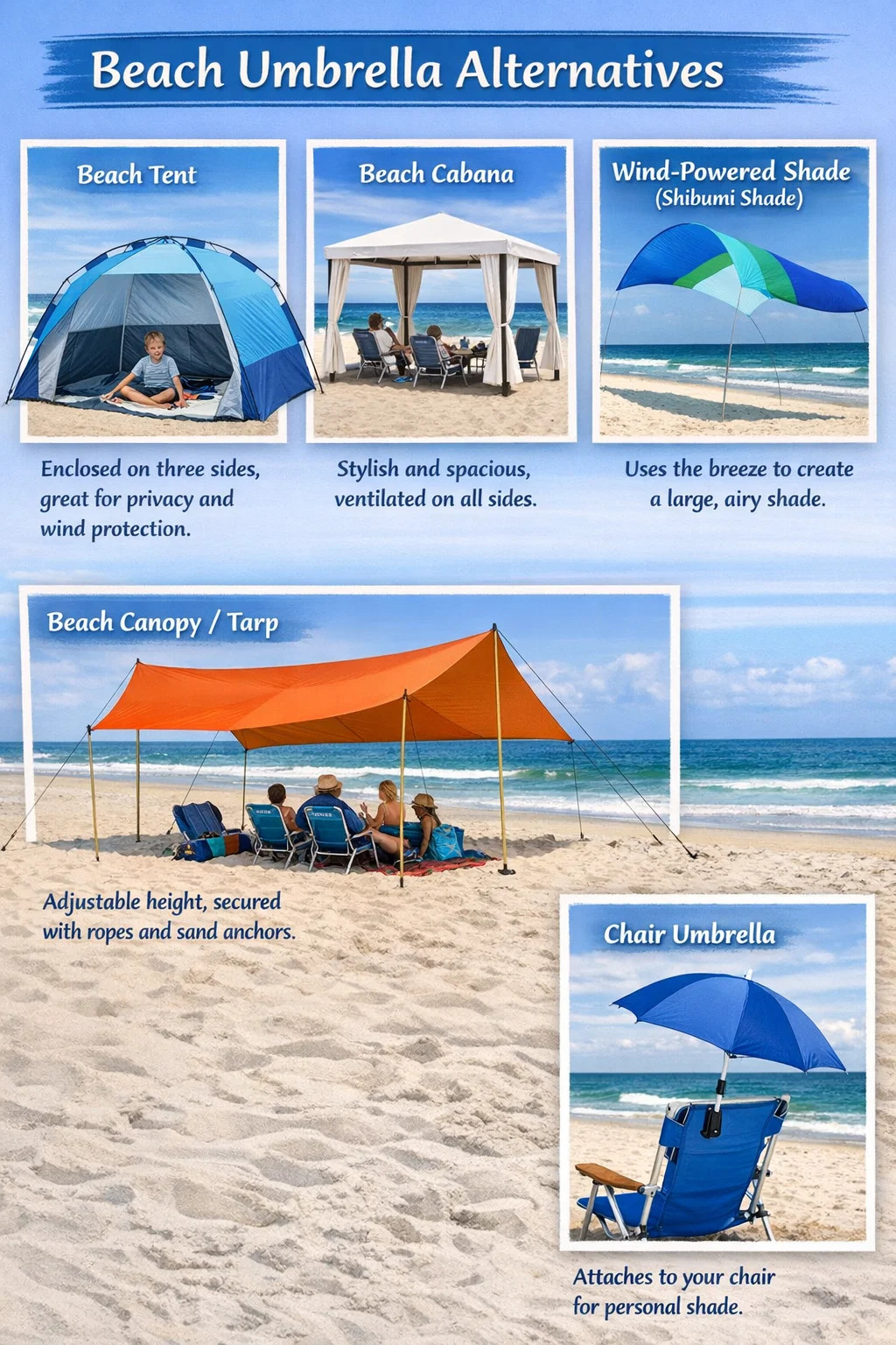 اگر حمل یا نصب چتر ساحلی را خیلی مشکل میدانید، یا نگران وزیدن آن توسط باد هستید، جایگزینهای بسیار پایدارتری با مناطق سایهدار بزرگتر در بازار وجود دارد.