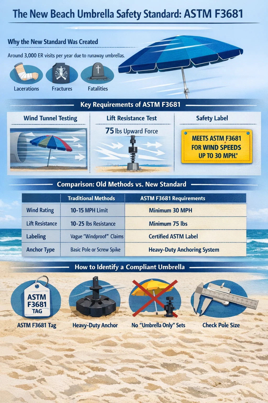 قبل از معرفی ASTM F3681، بسیاری از ساحلنشینان به روشهای «چسباندن و چرخاندن» تکیه میکردند که ایمنی واقعی بسیار کمی را ارائه میکرد. جدول زیر تنظیمات سنتی را با الزامات مقایسه می کند استاندارد جدید چتر ساحلی .