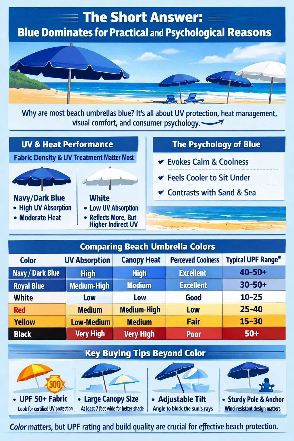 در امتداد هر ساحلی - از میامی تا مدیترانه - قدم بزنید و متوجه خواهید شد که آبی به مراتب رایج ترین رنگ برای چترهای ساحلی است. این تصادفی نیست. چترهای آبی ساحل به دلیل ترکیبی از مدیریت اشعه ماوراء بنفش، عملکرد حرارتی، راحتی بصری و قرارداد تجاری که در طول دهه ها ایجاد شده است، غالب شدند. اما رنگ به تنهایی کل داستان را بیان نمی کند. بافت پارچه، فناوری پوشش و قطر سایبان به اندازه سایه ای که از قفسه برمی دارید اهمیت دارد.